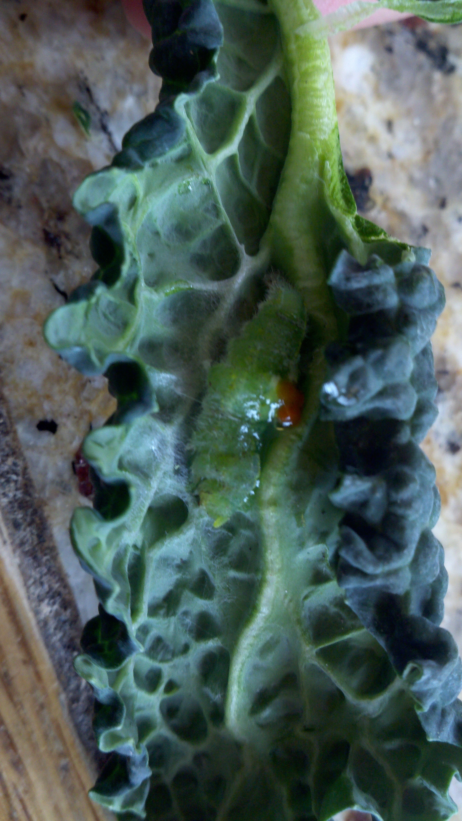 I had tried to enlist my older boy to help me rip the leaves from the stems, but he was more interested in playing with the cabbage worm we found.  I saw some of the adult white moths flitting around the garden last week and figured they were laying eggs somewhere.  They work fast — it hasn’t been warm that long!