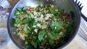 One of the other recipes was for a watercress and barley salad.  I still have a ton of watercress, so I was glad to see a recipe that called for 3 cups of watercress.  The other ingredients were:  cooked barley, celery, red bell pepper, and pear;  the dressing was fresh OJ, olive oil and apple cider vinegar; on top, pecans and blue cheese crumbles.