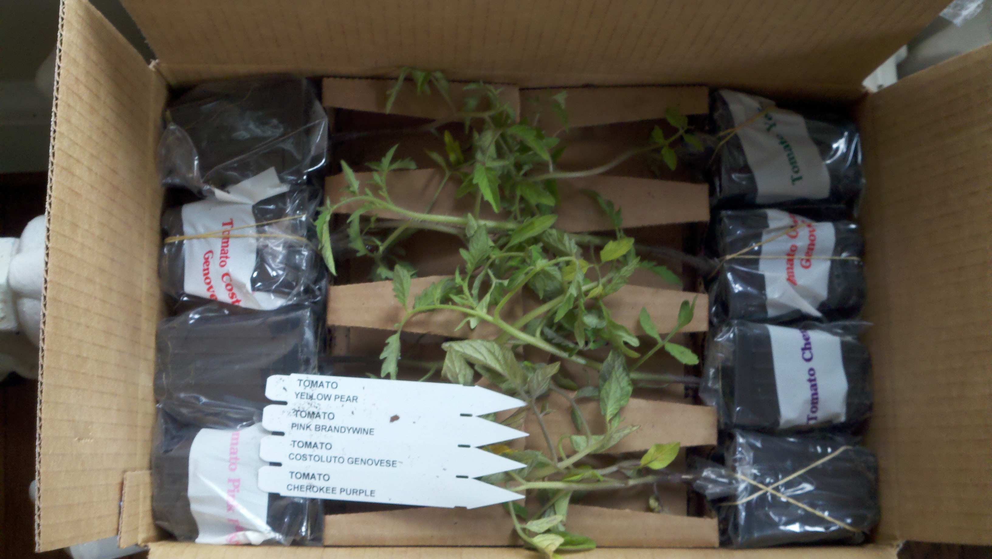 I had no idea what was in today’s box, but I noticed a distinct smell as I was cutting through the tape — tomato plants, and “heirloom” varieties at that: