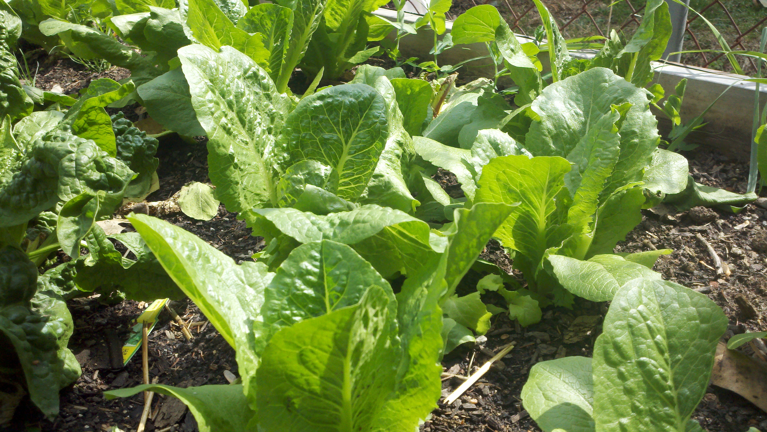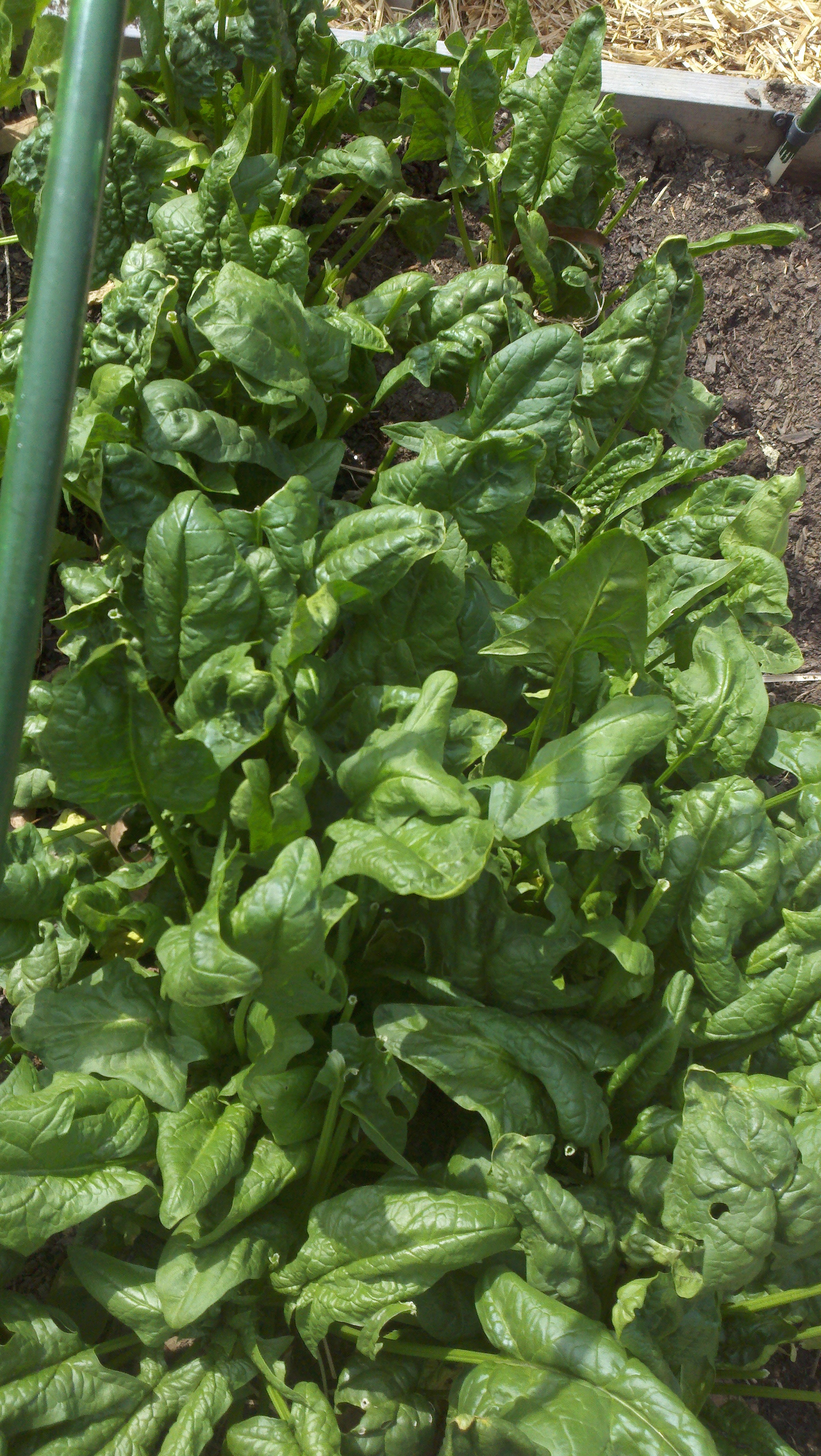 Above are some of the romaine starts James planted several weeks ago. I’ve been picking the outer leaves and mixing them with the explosion of spinach leaves (at right):
