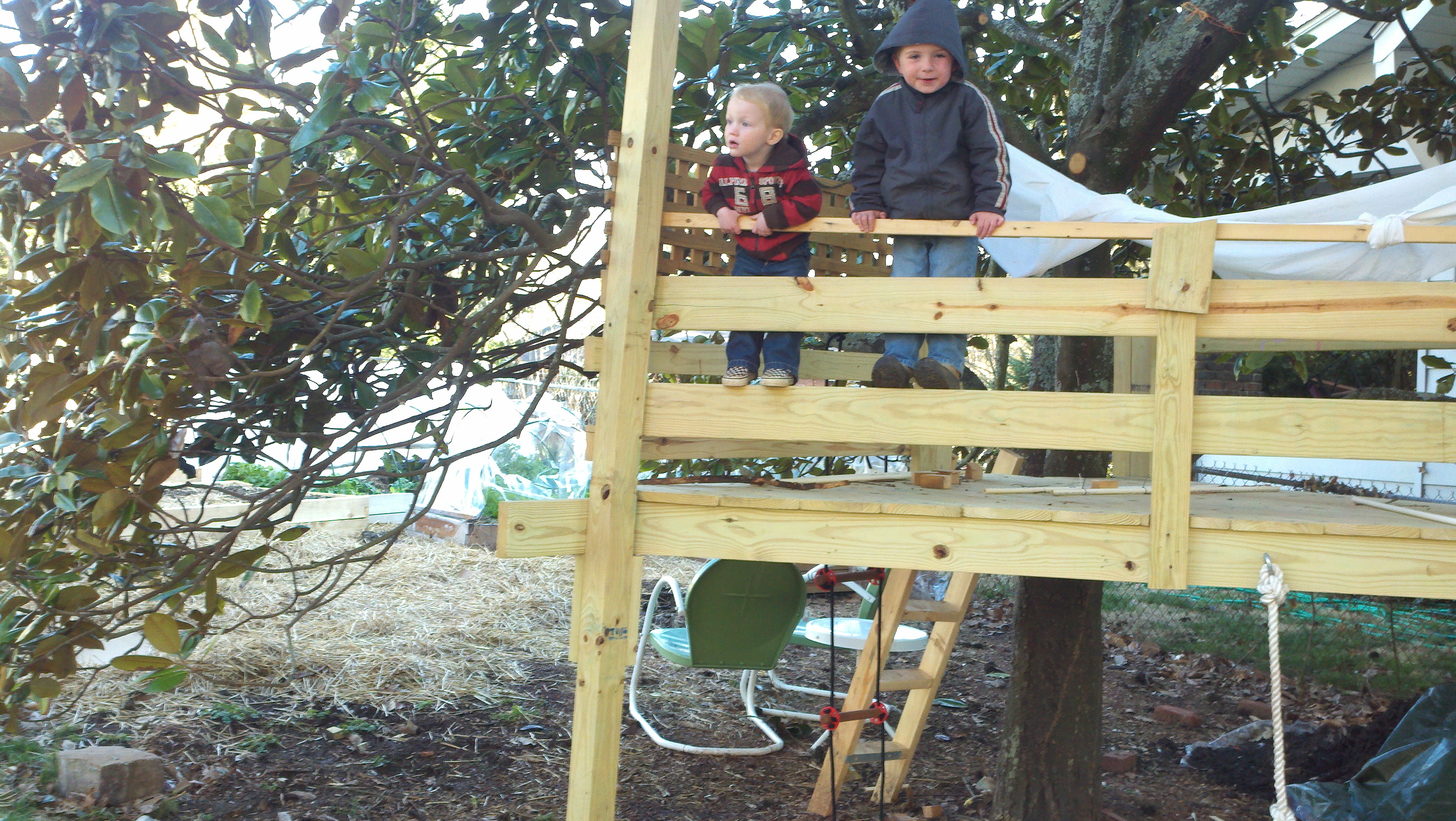 Sure enough, our neighbors had a swarm in their backyard. We told Andy, the beekeeper, that we had an empty bee box in our yard and were on a wait-list for getting bees this spring. He told us he’d captured 3 swarms in the past week, so he was all set on hives, and he offered to give us these bees. Woohoo!