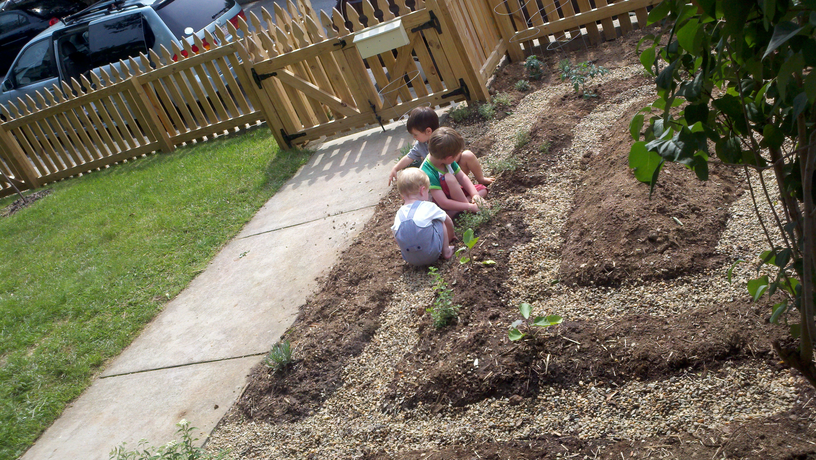 Of course, the boys were totally taken with the entire process — especially the bee suits. How cool to be able to look like a spaceman/alien and it doesn’t even have to be Halloween! They didn’t get too close to the hive but were watching what we were doing. They’re only 4 and 2. I wonder if it was instinct helping them keep a safe distance, or if they were following James’s lead (who didn’t have a suit but was also trying to watch from a couple yards away).