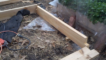 The ends of the pieces of lumber fit together after they've been cut. We cut and stacked another layer on top of these (making the beds 12" deep), then drilled holes all the way through the overlapping ends and secured them with metal dowels.
