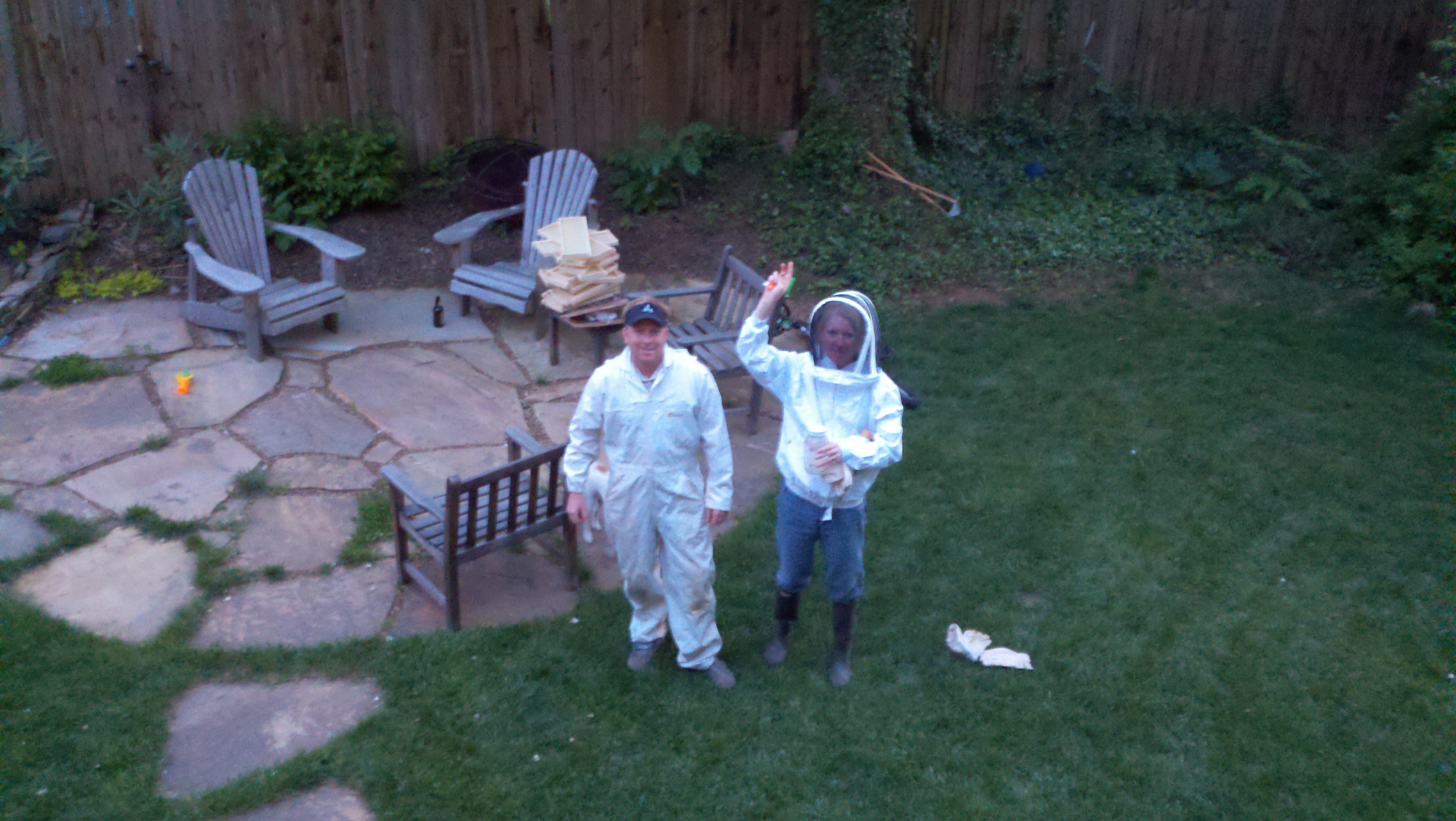After we’d gotten the racks of bees transferred, we sat in the yard and were mesmerized watching them flying around the hive and getting their bearings.