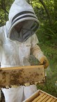 To welcome the bees to their new home, my 3-year old boy donned his suit and helped hand supplies to us as we transferred the bees from the nuc box to their bigger, permanent box: